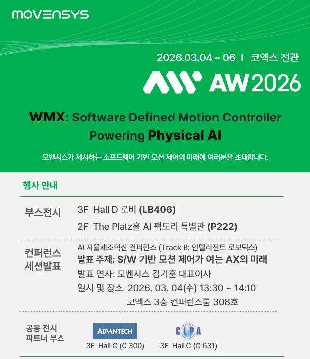 생성형 AI의 부상과 함께 산업 자동화는 새로운 혁신의 전환을 맞이하고 있습니다. 모벤시스는 이번 AW 2026에서 “끊임없는 기술 혁신을 통해 사회 변혁에 기여한다”는 경영이념을 실현하며,'소프트웨어 기반 모션 제어 기술(WMX)'과 'Physical AI 솔루션'을 선보입니다.